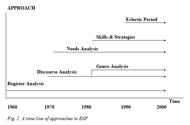 This will be returned to later. However, whilst perhaps there have not been major changes as such, it can be noted that practitioners are taking advantage of all previous facets of ESP in order to present students with a mix to fit their particular situation. This present period may thus perhaps be called the eclectic period (see Fig. 2 for an overview of the developments in ESP since 1960). The diagram shows all the main approaches on a time-line, highlighting the fact that all the previous approaches are available to the practitioner today.